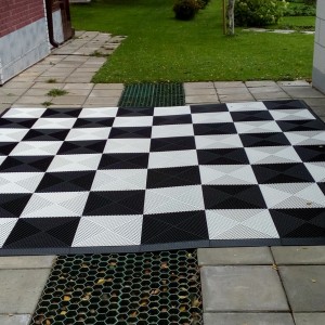 Поле изготовлено в виде сетки, чтобы после дождя не оставались лужи. Поле изготовлено из крепкой пластмассы. По полю можно ходить. Материал поля противостоит любым погодным условиям и перепадам температур. Основание под шахматное поле должно быть ровным твёрдым.