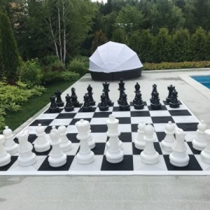 Большая шахматная доска для улицы с обрамлением 3.3х3.3 м с повышенными эксплуатационными свойствами. Поле сборное состоит из 32 белых и 32 черных квадратов, со стороной квадрата 40 см. Каждый квадрат имеет свои замочки крепления.